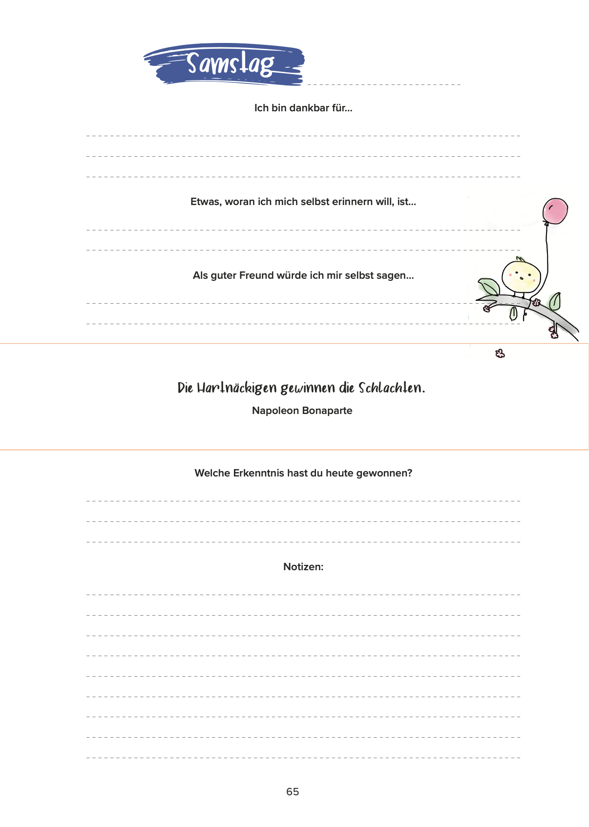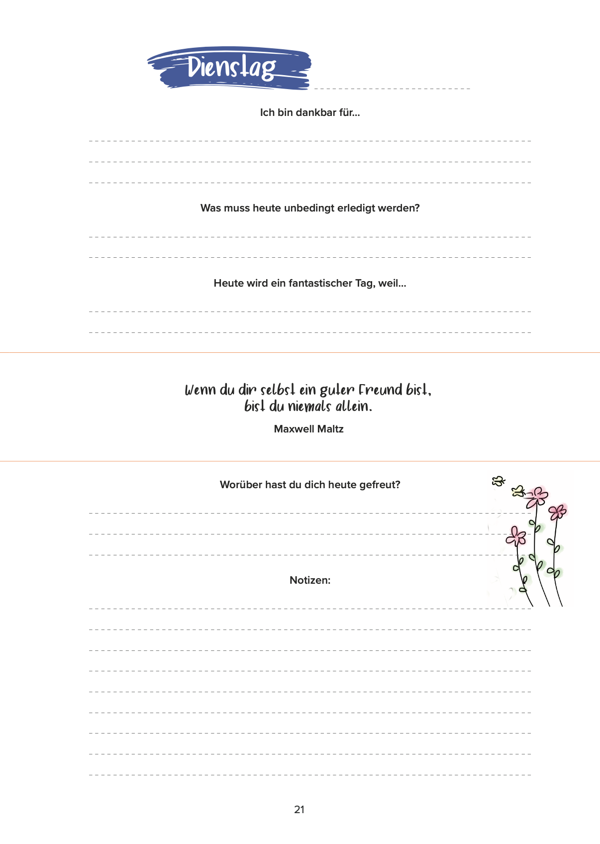 Jeden Tag beginnst du mit einer großen Portion Motivation. Auf jeder Seite findest du ein inspirierendes Zitat oder eine kleine Herausforderung.