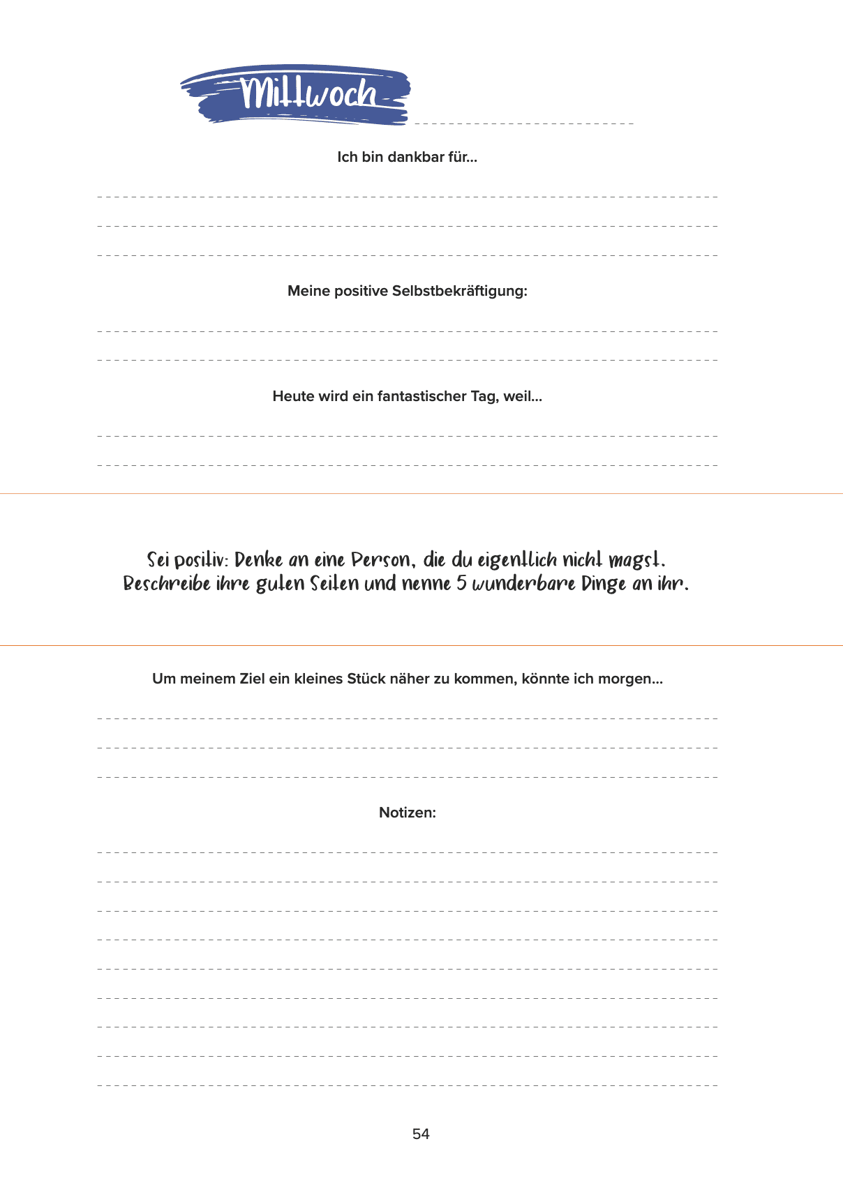 Morgens beantwortest du 3 kurze Fragen und abends kannst du deine Gedanken aufschreiben oder den Tag reflektieren. Das sorgt dafür, dass du Stress abbaust, negative Gedanken loswirst und dich auf das Positive konzentrierst.