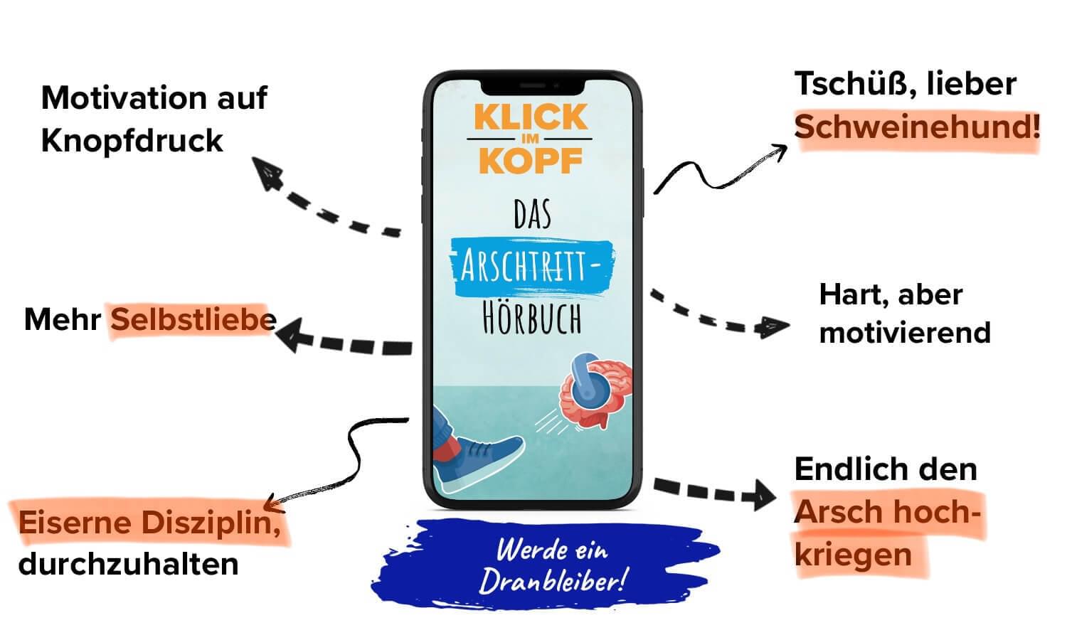 Dann sichere dir das nagelneue Klick im Kopf Arschtritt-Hörbuch noch heute!